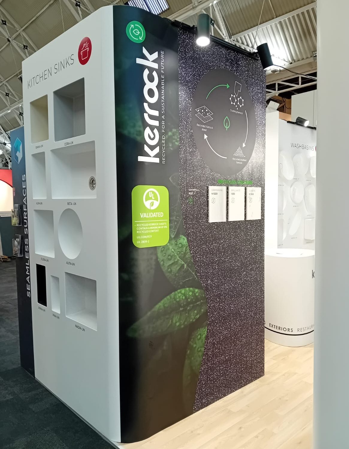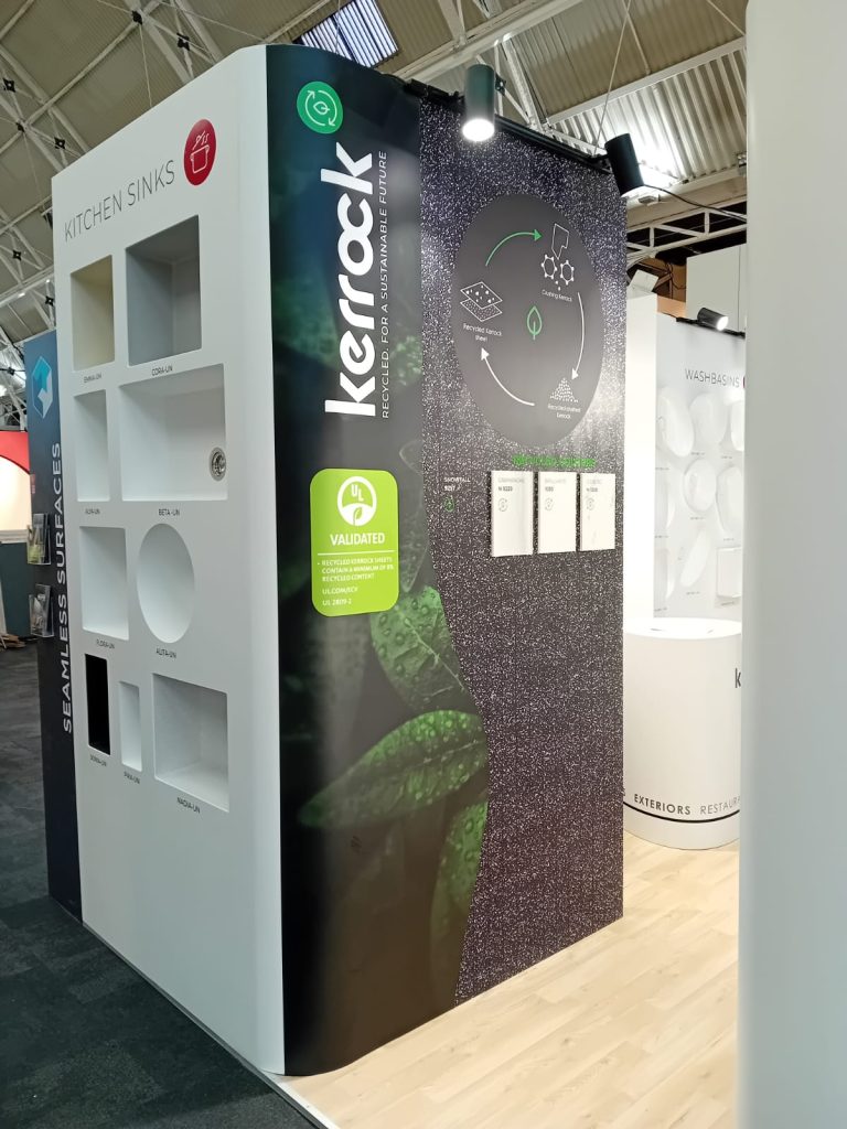 Kerrock is made with ecological responsibility in mind. Its production incorporates advanced technologies that reduce the impact on the environment. The material is recyclable and contains no harmful substances, making it safe for use indoors and in direct contact with food. It also boasts RECYCLED CONTENT certification, which certifies its sustainability.